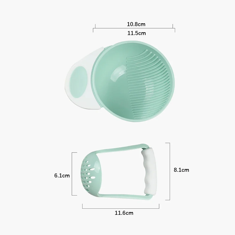 【Easy to Use】Easily coverts fruit and steamed veggies into baby food. Mash and serve in the same bowl. fit together,allowing you to scrape out every bit of food.Everything is easy to clean and super comfy to hold.